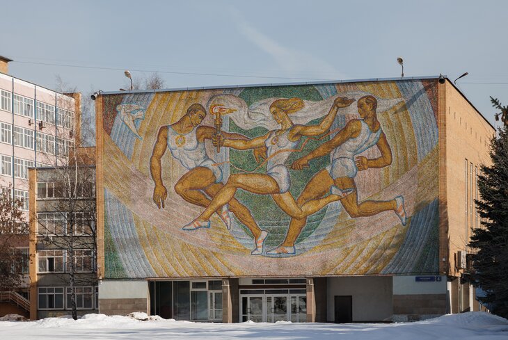 Автором одного из самых поэтичных и аполитичных панно в городе стала Клавдия Тутеволь, ученица Александра Дейнеки, делавшего эскизы мозаик для «Маяковской». Ее работа 1972 года «Эстафета» украшает фасад Российского университета спорта. Ни бассейн, ни скульптуры на его территории до наших дней не сохранились, монументальная мозаика — это все, что осталось от былого великолепия оформления бывшего Института физкультуры.