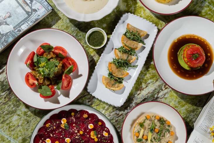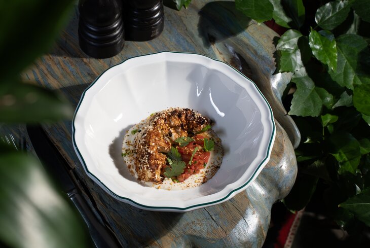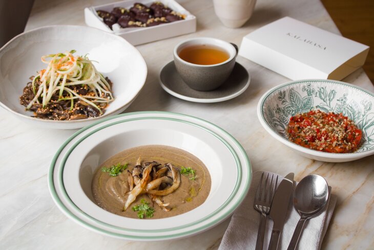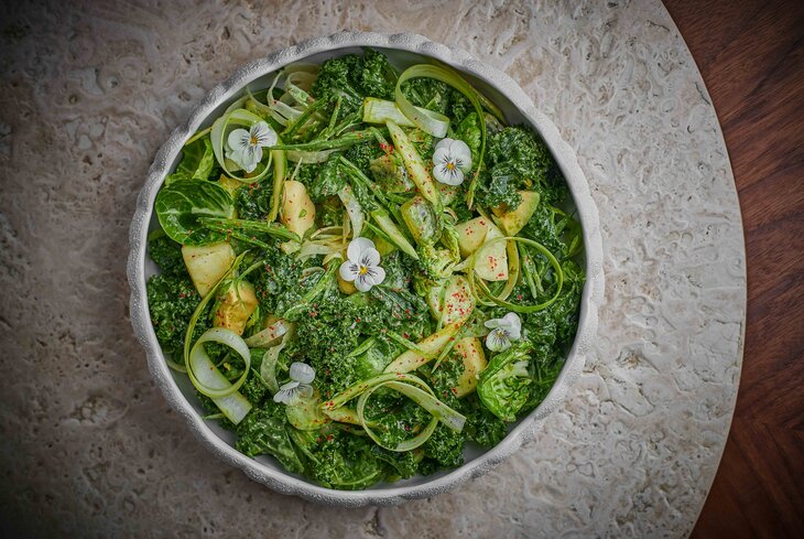 Одно из немногих мест в Москве, где готовят грузинскую закуску ацецили из баклажанов (1 100 рублей). Для нее овощи не режут идеальными кубиками, а шинкуют произвольно или рвут руками. Из более сытных вариантов — пхали из запеченной тыквы (640 рублей), крем-суп из брокколи и шпината (710 рублей) и борщ на овощном бульоне, с красной фасолью и чесночными гренками (450 рублей). Из десертов — кутаб с вишней (360 рублей).