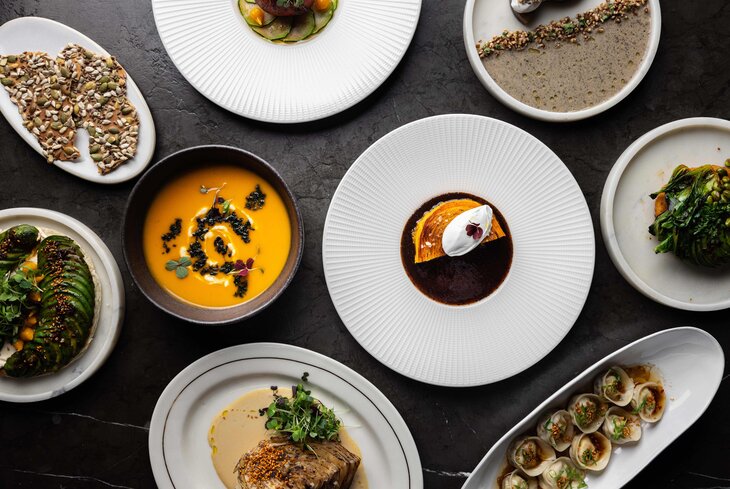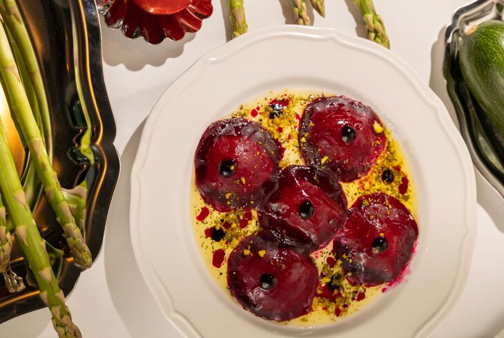 У шефа ресторана на «Белорусской» Дмитрия Голенина всегда особенный подход — уже четвертый год он придумывает веган-меню, на этот раз к нему идет безалкогольный пейринг от шеф-бариста Виктора Воробьева. Шесть блюд и четыре напитка: сельдерей подают с нутовым кремом (950 рублей), карпаччо из упругих грибов эринги (650 рублей) и суп с пророщенным машем (750 рублей). На горячее готовят ньокки из запеченного картофеля и фасоли (850 рублей), а на десерт — кокосовое мороженое с шоколадом, перцем и нутовым безе (850 рублей).