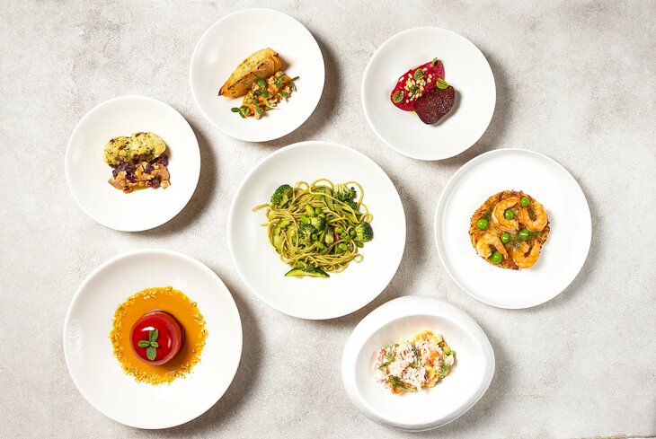 В роскошном ресторане на Кутузовском создали меню с 19 позициями. Не пропустите супы — минестроне по-тоскански (860 рублей), каштановый с черным трюфелем (1 295 рублей) и томатный с базиликом (1 225 рублей), который подают с французским багетом. А еще пасту — равиоли с грибами и сыром тофу (1 290 рублей), тальятелле по-болонски (1 290 рублей) и ризотто с зеленой спаржей (1 325 рублей).