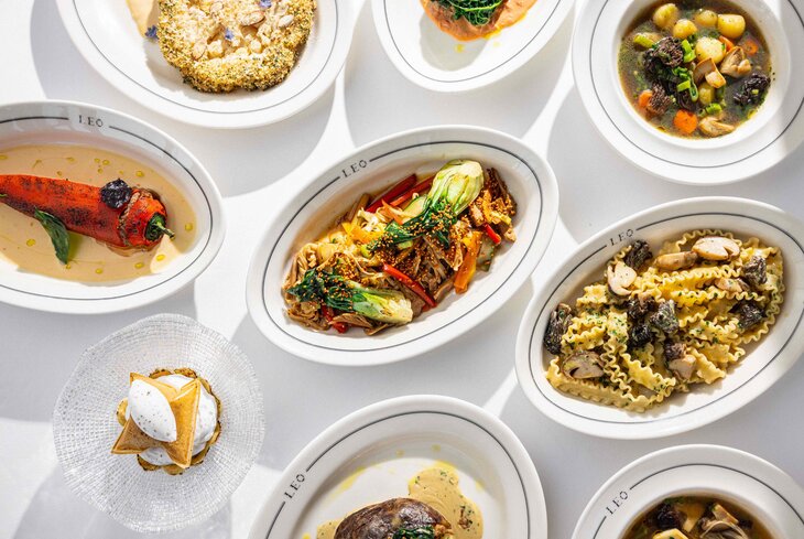В недавно открывшемся Leo на первом этаже модного ЖК адаптировали средиземноморские хиты. Одну из самых популярных постных закусок — хумус — здесь готовят из баклажанов с томатами (1 400 рублей). Затем заказывайте пиццу с цукини (4 500 рублей), удон с овощами (2 200 рублей) и стейк из цветной капусты с миндалем (1 200 рублей). Еще тут придумали постные фастфуд-перекусы — хот-дог с картофелем фри (1 200 рублей) и бургер (1 900 рублей).