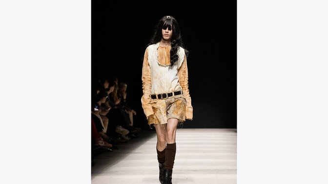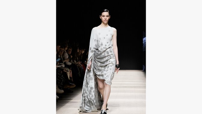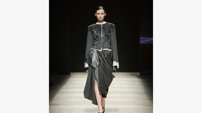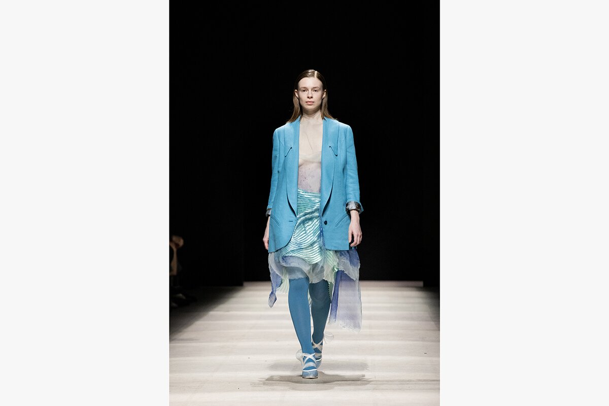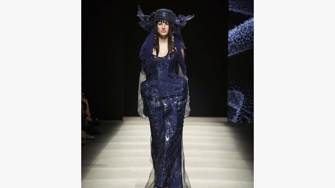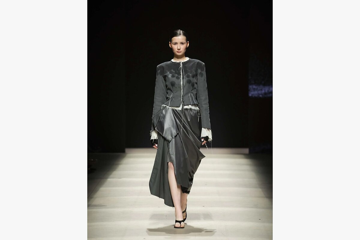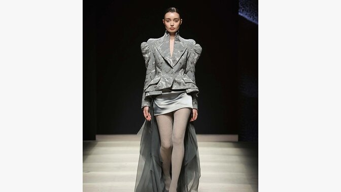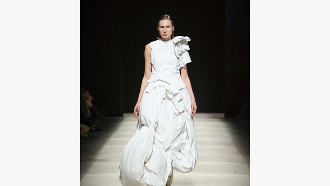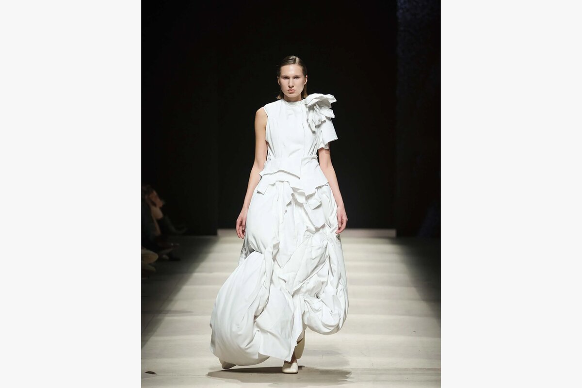 Показ открыли отсылки к архивам — знаменитому жакету Bar от Christian Dior, где основное внимание уделялось работе с формой. Далее действие перенеслось через эпоху Николая II, представленную мужскими образами Ильи Шадрина, к современному стрит-фэшну. Кульминацией дефиле стал возврат к истокам академизма: финальный выход — модель в кринолине и юбке с панье. Вместо классического свадебного платья заключительным акцентом стал образ, построенный на контрасте между исторической основой и авангардным верхом.