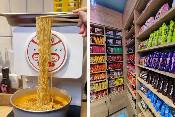 Здесь, как и везде, нужно выбрать лапшу, мясо и топинги (среди них маринованные яйца, бамбук, капуста кимчи и микс сыров), а после добавить кипяток с помощью корейского автомата. Одна тарелка обойдется в среднем в 350 рублей.
