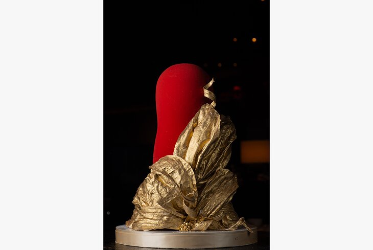 Минималистичная матрешка с оболочкой из белого шоколада. Внутри — классический кулич с ромовым изюмом. Композицию дополняет золотое съедобное украшение из шоколада, которое контрастирует с ярко-красным корпусом. Таких куличей сделали немного — всего десять штук.