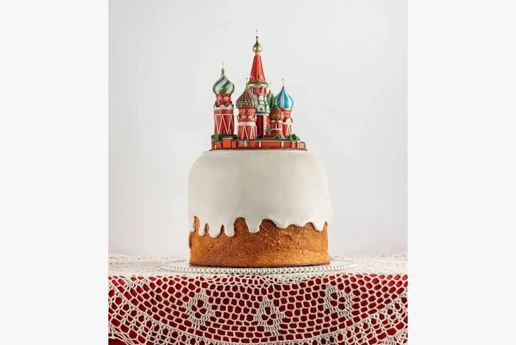Самый роскошный десерт в подборке. Весит кулич около четырех килограммов и стоит ровно 100 тысяч рублей, то есть примерно 25 тысяч за килограмм. При этом само изделие выглядит довольно сдержанно: высокий кулич с плотной коркой и толстой шапкой из белой глазури. Но главный акцент здесь на декоре: сверху его украшает детализированная шоколадная копия храма Василия Блаженного.