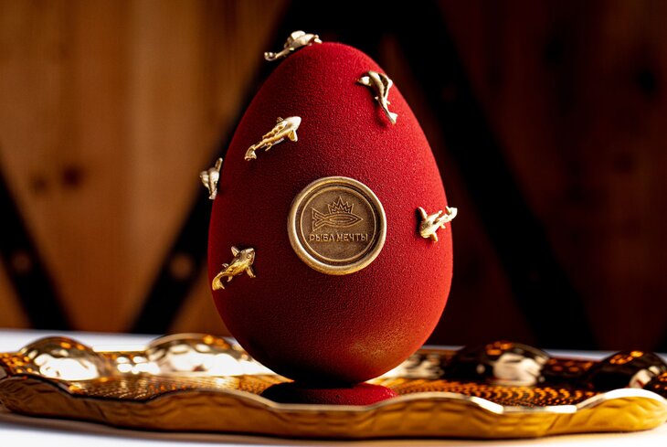В пасхальной коллекции рыбного ресторана появились фигурные яйца из темного шоколада (5 000 рублей). На выбор — два велюровых покрытия: белый с золотыми ракушками или красный с рыбками. Наполнение у обоих десертов одинаковое: пекан, сублимированный фундук, драже из арахиса в шоколаде и конфеты — молочные с воздушным рисом и карамельные с вафельной крошкой.
