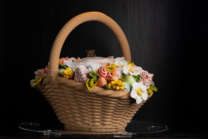 Самый роскошный вариант — съедобная пасхальная корзина (55 000 рублей) весом семь килограммов. Композиция сделана целиком из бельгийского молочного шоколада, бонусом внутрь кладут кулич и зефирные цветы.