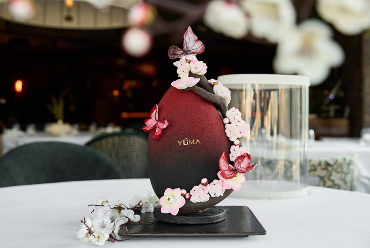 Подготовку к Пасхе совместили с ожиданием цветения сакуры. Так появилось яйцо с цветами и бабочками из молочного шоколада (11 000 рублей). Его покрыли велюром и наполнили конфетами с разными начинками.