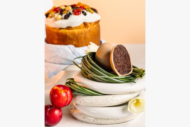 Сразу два десерта придумали в ресторанах. Внутри «Пасхальной корзины» (890 рублей) — фундуковый дакуаз, пралине и крем на апельсиновом шоколаде и гречишном чае. «Красное-прекрасное» (950 рублей) понравится любителям яркой кислинки. В начинке шоколадного яйца — цитрусовый конфитюр, ягодное компоте, миндальный крамбл и ванильно-сливочный крем.