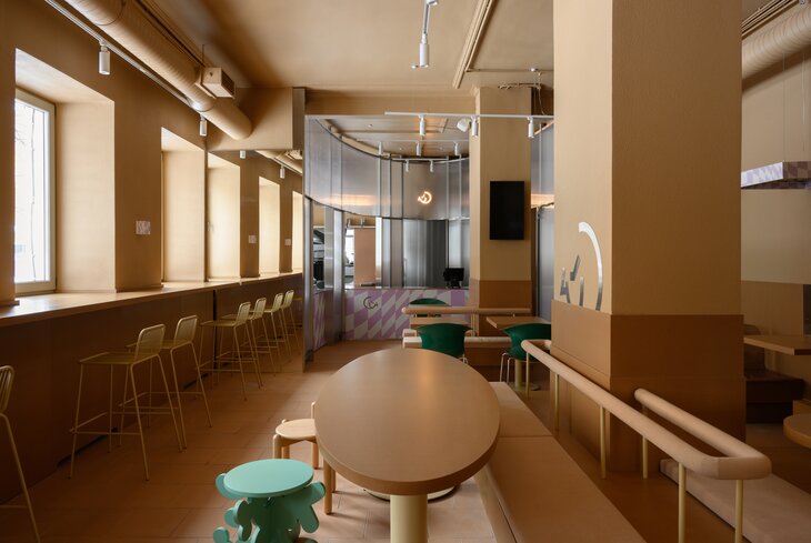 На первый взгляд и не скажешь, что здесь готовят фастфуд: внутри так же стильно, как в какой-нибудь модной кондитерской. По словам создателей, готовят исключительно диетические и диабетические позиции. А еще это первый в Москве стритфуд, где считают калории и количество белка.