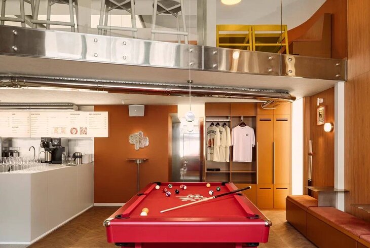 Бистро, где на небольшой площади умудрились уместить открытый бар, один бильярдный стол и несколько десятков посадочных мест. Вдобавок по выходным прямо тут играют диджеи. В меню собрали европейские и американские блюда: от тартара (840 рублей) и аранчини (780 рублей) до говяжьих колбасок (610 рублей). Центр меню — сочные смэш-бургеры с картофельными булками. Между ними укладывают сытную начинку — фарш с чеддером и вишней (650 рублей) либо мясо с сыром и маринованными огурцами (680 рублей). На завтрак готовят блюда из яиц, тосты, драники.