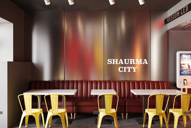 Среди более знакомых позиций — 12 видов шаурмы (от 299 рублей), картофель фри (от 200 рублей), наггетсы (от 180 рублей) и шашлык (от 349 рублей). Готовят все это на открытой кухне два на два метра, а перекусить можно прямо на месте, сидя на ярких желтых стульях или красных диванах.