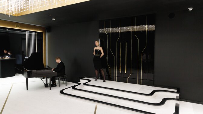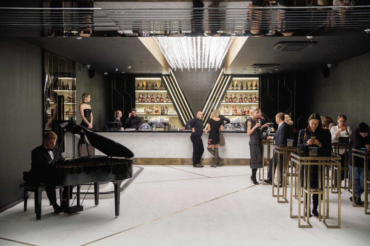 Театр-кабаре видно издалека: его светлая дверь – единственное яркое пятно на Лубянском проезде. Гостей встречает швейцар в смокинге, он же проверяет билеты. Паспорт тоже спрашивают, если есть сомнения, что гость совершеннолетний: аудитория строго 18+. Интерьер помпезный, как в парижском Мулен Руж, только вместо красного – золото и антрацит. Плюс сто к атмосфере добавляют девушки на каблуках с дресс-кодом total black. Кстати, зрителям определенно не стоит заявляться сюда в носках с сердечками и балахоне: выбирайте свой самый парадный наряд. В холле работает бар, за столиком можно выпить бокал шампанского, который входит в стоимость билета. В меню – вино и крепкий алкоголь, закуски: устрица с черной икрой (3 800 рублей за 14 граммов), черная икра (4 500 рублей за 20 граммов) и шоколад ручной работы Crave mask (300 рублей за три штуки).