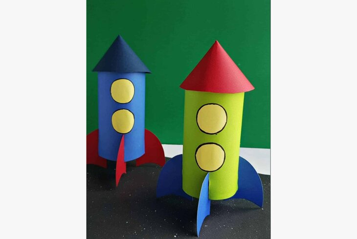 Обклейте втулку цветной бумагой. Из бумажного круга сделайте конус и приклейте его на верхушку ракеты. Сделайте «иллюминаторы» из бумажных кругов серого цвета.