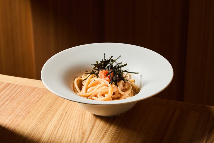 Спагетти ментайко в сливочном соусе (1 500 рублей) — на мой вкус, лучшее блюдо в Motto Azabu. И даже если у вас совсем не трещат карманы от денег, накопите эти полторы тысячи и попробуйте эту удивительную пасту. Если не знаете, ментайко — это японская пикантная маринованная икра минтая. Стоит как крыло самолета и совсем не похожа на икру минтая в российской версии.