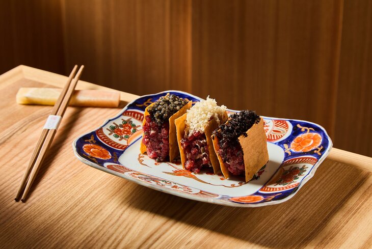 Тартар из говядины со свежим хреном (2 700 рублей) — настолько ёсёку, что почти Франция. Особенно с учетом того, что хрен здесь никакой не васаби, а нормальный отечественный. За японскую часть блюда отвечает сложно сконструированный соус — не соевый, но на его основе.