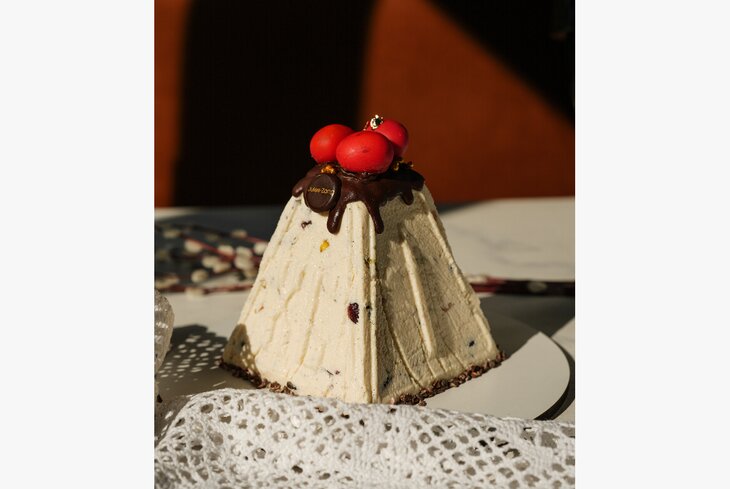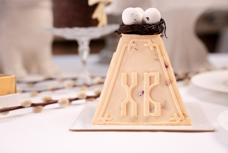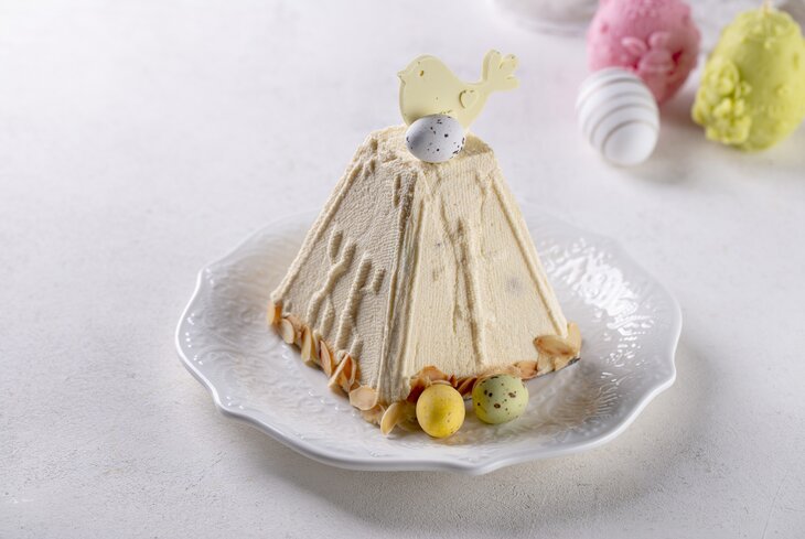 Здесь пасхальный десерт делают из фермерского творога с мадагаскарской ванилью, цукатами из апельсина и вишни. Украшают верхушку шоколадные яйца ручной работы.