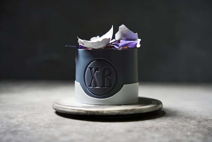 Творожная пасха в тонком шоколадном корпусе выполнена в сине-серебристой гамме, сверху ее украшают живые цветки анютиных глазок. Готовят традиционный десерт из фермерского творога с начинкой из кураги, вяленой хурмы, клюквы и жимолости.