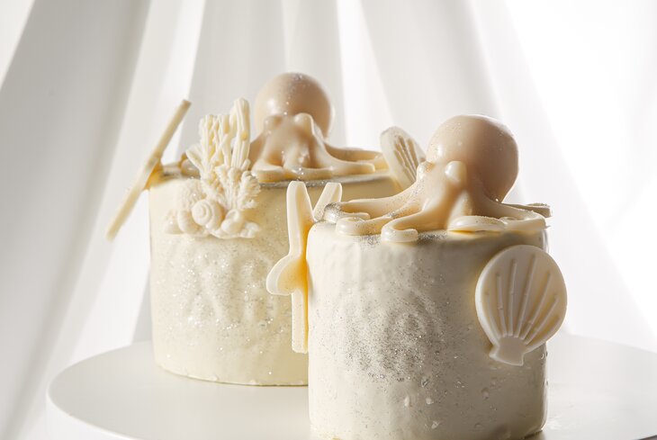 Шеф-кондитер ресторана подготовила классические творожные пасхи с мягкой сливочной текстурой. Сверху их украшают осьминогами из лимонного желе и шоколадными ракушками.