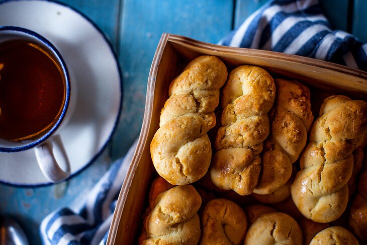 В греческом ресторане в честь праздника готовят традиционное апельсиновое печенье кулуракья (190 рублей). Внешне оно похоже на спирали и небольшие косички.