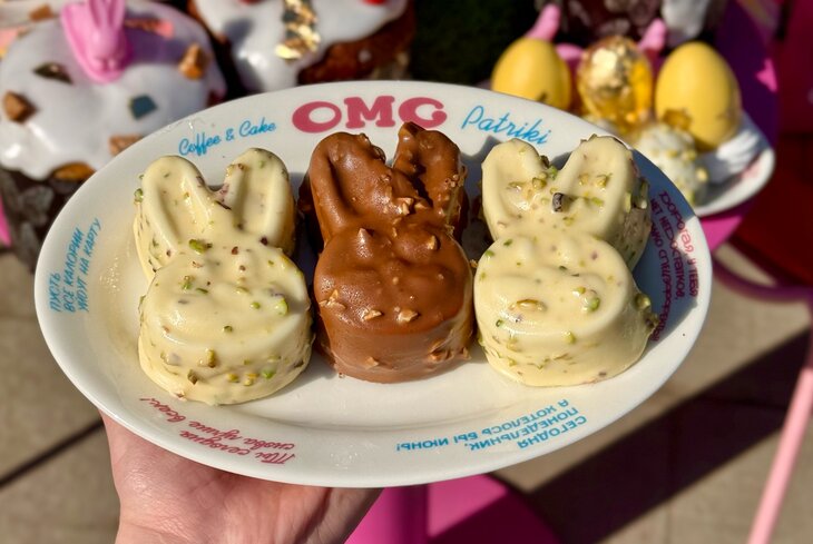 В этом сезоне в коллекции праздничных десертов появилось пирожное «картошка» в форме пасхального яйца (690 рублей), на выбор два вкуса — с фисташкой или апельсином. Еще в кофейне сделали шоколадные конфеты в виде зайчиков — с малиной или орехами (250 рублей).