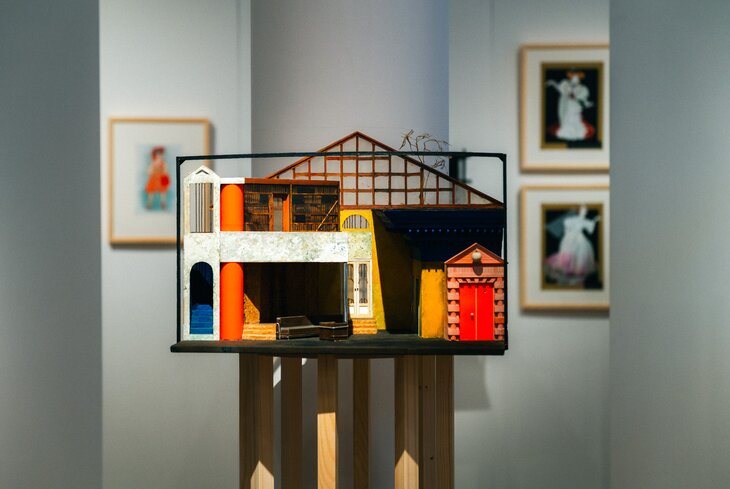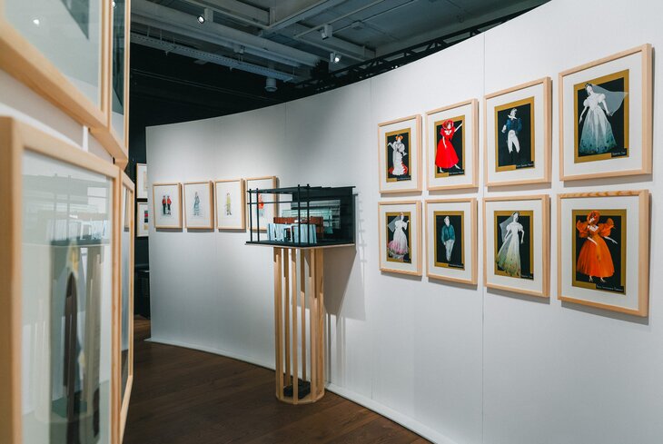 Выставка занимает один небольшой зал Музея-квартиры Боровского. Там возвели колонны и ротонды, напоминающие фасад на Чистопрудном бульваре. Такое решение придумал театральный художник и сын сценографа Александр Боровский. Как раз между этими архитектурными элементами и расположили макеты оформления сцены. Дополняют их эскизы костюмов для актеров.