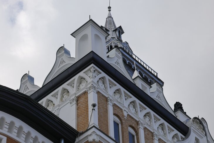 Изначально здание, построенное в 1908–1909 годах, выглядело еще более сказочно: литую чугунную ограду украшал улыбающийся лев в короне, а на крыше была установлена прорезная узорчатая решетка из металла. И то и другое демонтировали, когда надстраивали здание в 1945 году, добавив ему шестой и седьмой этажи.