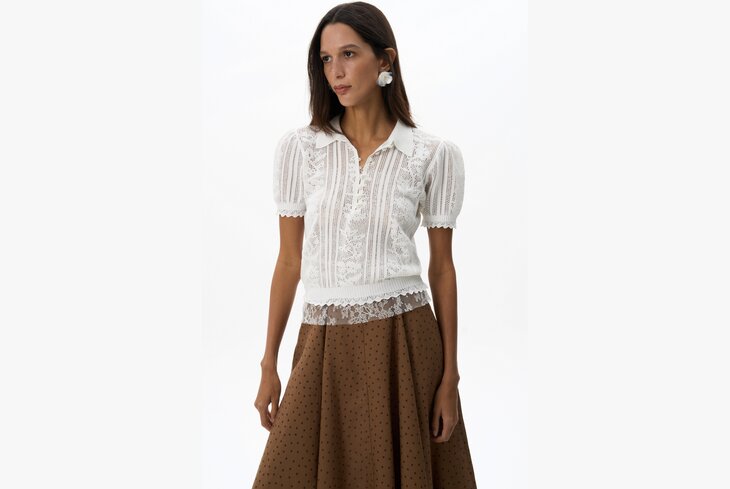 Нежная коллекция с акцентом на кружево и вышивку, в которой прослеживаются русские народные мотивы, например костюм из юбки (7 800 рублей) и поло (12 900 рублей) с орнаментом, отсылающим к узору на бабушкиной скатерти. А ностальгия, конечно, тренд!