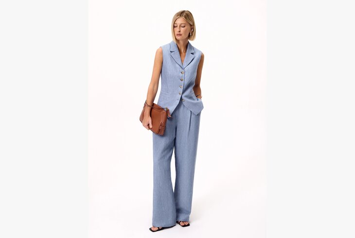 Вещи из новой коллекции получились сдержанными, но при этом женственными. В нее вошли, например, легкие льняные костюмы с жилетами (14 990 рублей за брюки и 12 290 рублей за рубашку). Они отлично подойдут для создания летних образов в офис. Для отпуска присмотритесь к хлопковым футболкам с морскими принтами (4 990 рублей) и тонким брюкам в голубую полоску (9 299 рублей).