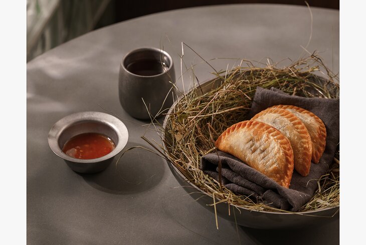 В частности, среди горячих закусок обнаруживаются мини-чебуреки — со щекой теленка (990 рублей) и с зеленью и яйцом (800 рублей). На самом деле это никакие не чебуреки, а пирожки из теста, которое обычно идет на индийские слоеные лепешки роти. Надо сказать, что сейчас по московским ресторанам пошла некоторая волна вот таких пирожков, кто-то называет их эмпанадас, кто-то мини-чебуреки, но суть одна. И вот с тестом для роти они получаются идеально (и вероятно, скоро все будут использовать этот прием).