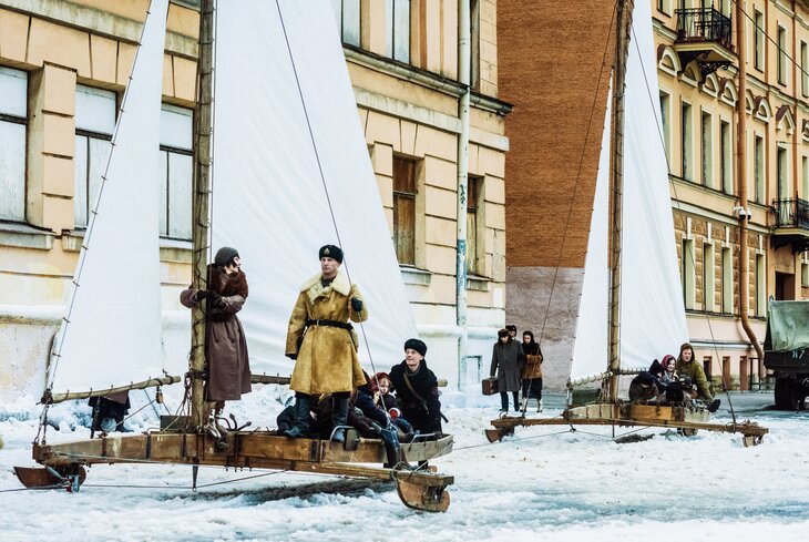 Буер — это легкая парусная платформа на коньках, которая движется по льду за счет ветра. Такие конструкции появились в России еще при Петре I. Зимой 1941 года в блокадном Ленинграде было сформировано два буерных отряда. Их называли «ангелами» — за почти невидимое появление на фоне льда и за надежду, которую они приносили. Буеры стали одним из самых быстрых способов связи на Ладоге: путь, который на машине занимал восемь-десять часов, они проходили за 30–40 минут. При хорошем ветре удавалось совершать по четыре-шесть рейсов в день. И для съемок фильма по чертежам и фотографиям сделали шесть таких буеров.