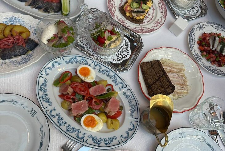 Пока открытие техническое, некоторых позиций из меню не было в наличии, например десертов. А в целом кухня сосредоточена на понятных всем с детства закусках. Есть бутерброды со шпротами, оливье, паштет, салат с редиской и многое другое. Один из самых интересных разделов — с коктейлями, многие посвящены известным песням и стихотворениям. Можно, например, попробовать «Сторону А/Сторону Б» «Каспийского груза» или «Для голоса» Маяковского.