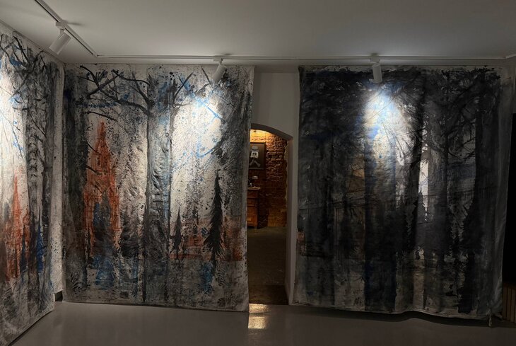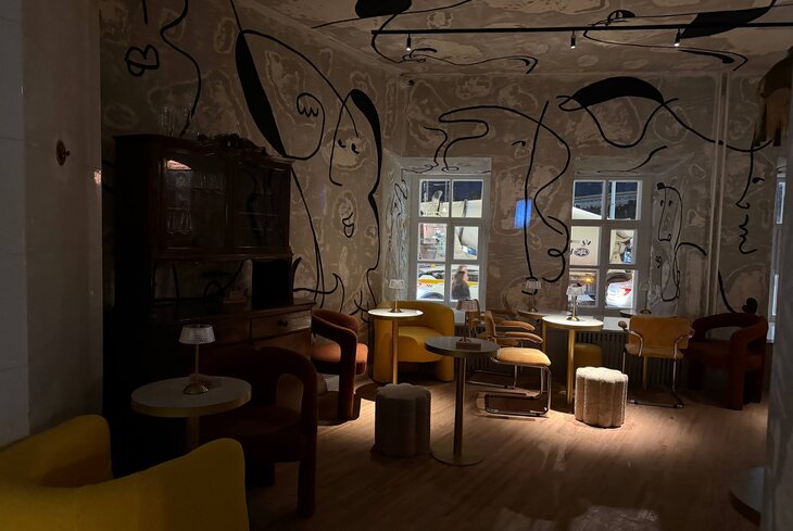 С улицы сразу попадаете в выставочный зал с гардеробом. Там сейчас висят черно-белые полотна художников KGallery. Мы узнали, что позже здесь же откроется кафе с книжным и винилом — получится мультипространство. Оно будет закрываться раньше тусовочной части заведения. Кстати, само кабаре работает с 18:00 до 02:22 по будням и до 03:33 по пятницам и субботам. И нет, у нас не сломалась клавиатура, организаторы задумали креатив даже со временем.