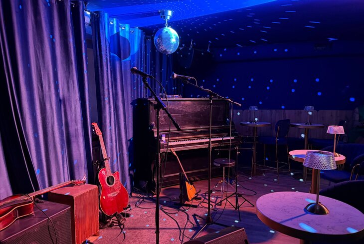 А потом по ступенькам попадаете в гостиную, застланную синим бархатом. Если по предыдущим залам сразу и не скажешь, что пришел в кабаре, то по этому ясно сразу. Здесь небольшая импровизированная сцена с микрофонами, пианино, гитарами и балалайкой. А за ней — много столиков, которые стоят близко друг к другу, но это никого не смущает, даже скорее наоборот. Места есть и по периметру зала — мягкие диванчики и высокие барные столы. Если смогли протиснуться близко к сцене, обратно рискуете выбраться не сразу, потому что все сидят плотно, вернее даже сказать дружно!