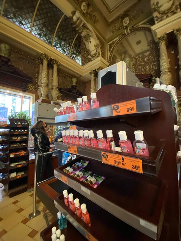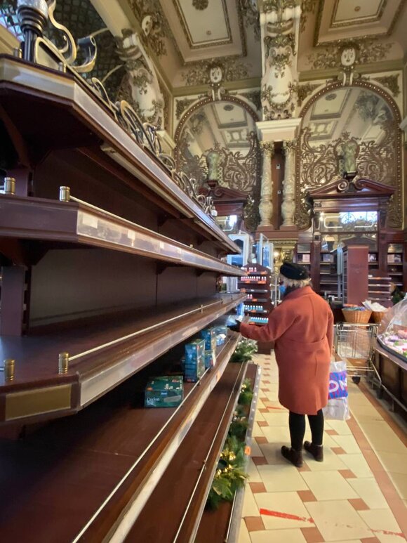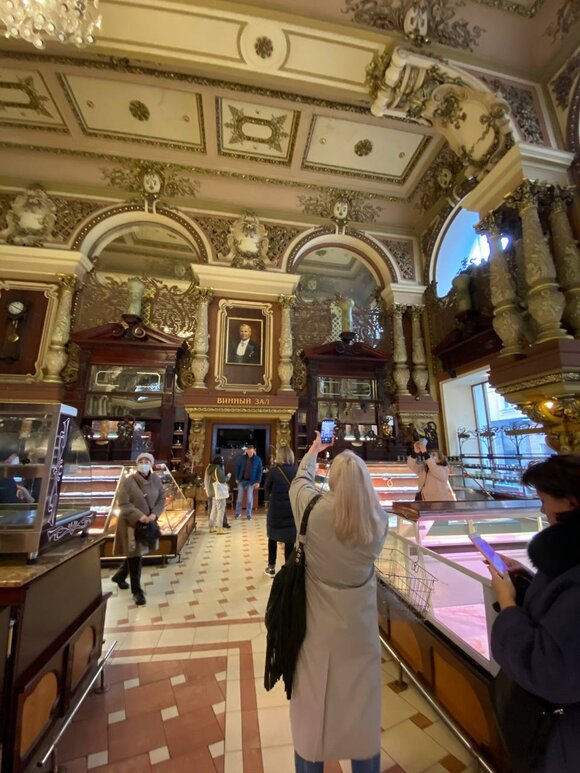 Непривычно пустые прилавки «Елисеевского» притягивают больше посетителей, чем обычно. В эти выходные многие приехали посмотреть на величественные интерьеры, потереть нос статуе Елисеева у входа и сделать фото.