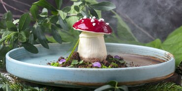 А вот для тех, кто любит необычные десерты, — медовик с грибами. Мы отнеслись к нему не как к торту, а как к экспериментальному блюду. Надо сказать, получилось очень здорово: грибы интересно сочетаются с кремом, а хрустящая посыпка придает десерту текстурности.
