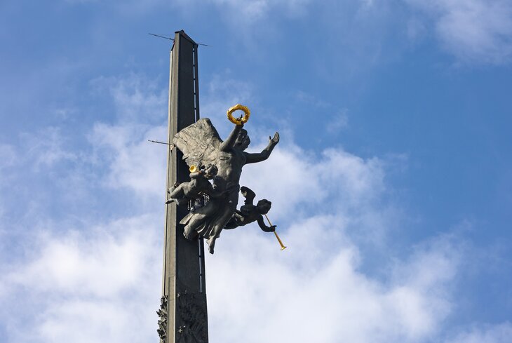 Обелиск в Парке Победы на Поклонной горе возвели в 1995 году. Это самый высокий памятник в России: его высота — почти 142 метра. Украшает монумент богиня победы Ника с ангелами. А у его подножия расположена скульптура покровителя Москвы — святого Георгия Победоносца. Он, как и на гербе столицы, расправляется с огромным змеем.