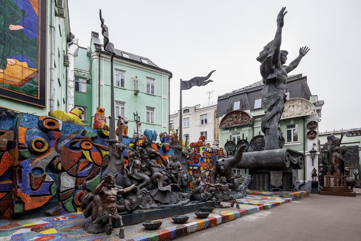 Произведения Зураба Церетели и собрание его монументальной скульптуры находятся во внутреннем дворике наряду с мозаичными и витражными композициями. На трех этажах представлено свыше 250 произведений живописи, графики, эмали и станковой скульптуры.