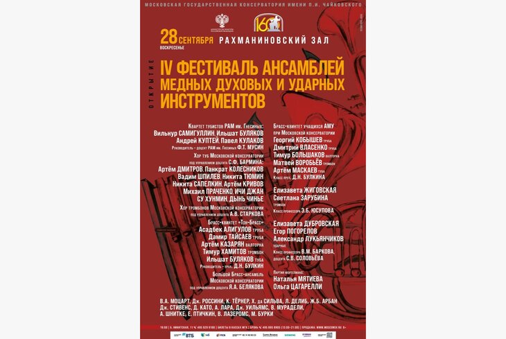 Завершится фестиваль 6 октября в Рахманиновском зале. На сцену выйдут ансамбль «Music-Брасс» под управлением Дмитрия Булкина с оригинальными сочинениями, брасс-квинтет New Life Brass с популярными классическими, джазовыми и эстрадными композициями. А в финале ждите выступление Большого брасс-ансамбля под управлением доцента Ярослава Белякова. Услышите музыку Арно Бабаджаняна, Берта Пейджа и многих других.
