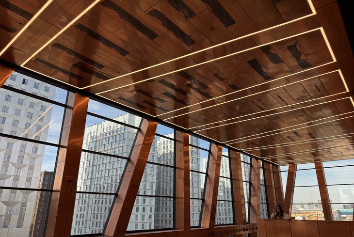 Со стороны это огромный медный куб со стеклянными вставками — у здания четыре больших выставочных зала с потолками в пять метров. Последнее означает, что тут будут выставляться в том числе и супермасштабные инсталляции. Архитектор Сергей Чобан рассказал, что медь — это материал, который умеет красиво стареть, и именно поэтому выбор пал на него. Это ключевой принцип музея: как живого организма, который постоянно меняется с течением времени. На первом этаже найдете лимузин 30-х годов, которые производил завод ЗИЛ и холодильник, попавший в это пространство по тому же принципу. Вообще классная фишка всего пространства (как, впрочем, и района) — это преемственность, здесь будут много рассказывать об истории района и о его заводском прошлом.