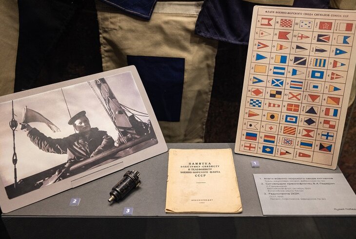 Увидите сюжетные фотографии связистов за работой, плакаты времен войны, печатные издания, рисунки фронтовых художников — Леонида Сойфертиса и Ореста Верейского. Экспозицию дополняют архивные документы, например, схема радиосвязи 57-й армии и списки условных фамилий для переговоров по специальному телефону. Один из разделов посвятили способам связи между различными видами войск. В нем узнаете о таблице знаков для связи наземных войск с авиацией и сигнальных флагах Военно-морского флота.