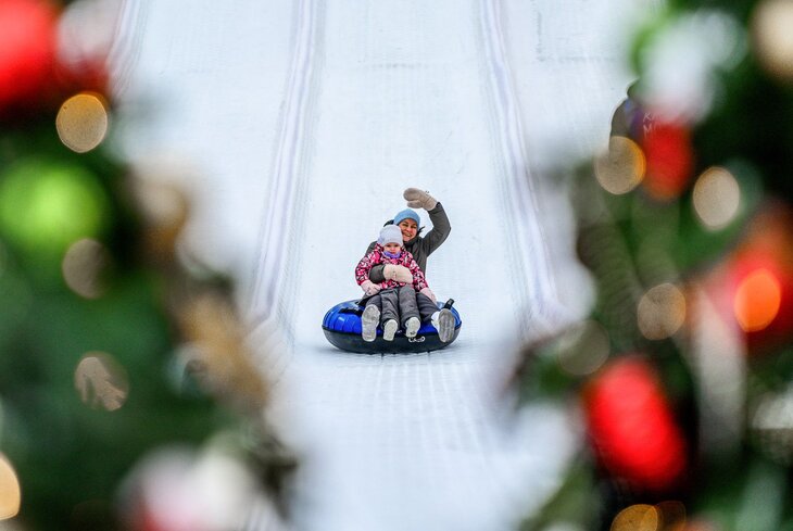 Тюбинговая горка откроется на центральной площади кинопарка. Она будет работать всю зиму. Всего появятся четыре спуска: два по 115 метров и два по 75. Подняться наверх можно на траволаторе с пандусом.