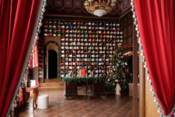 Можно побывать сразу в нескольких комнатах: в гостиной с бархатными диванами, стеллажами с подарками, почтой и хрустальной люстрой, зале, а также в рабочем кабинете.