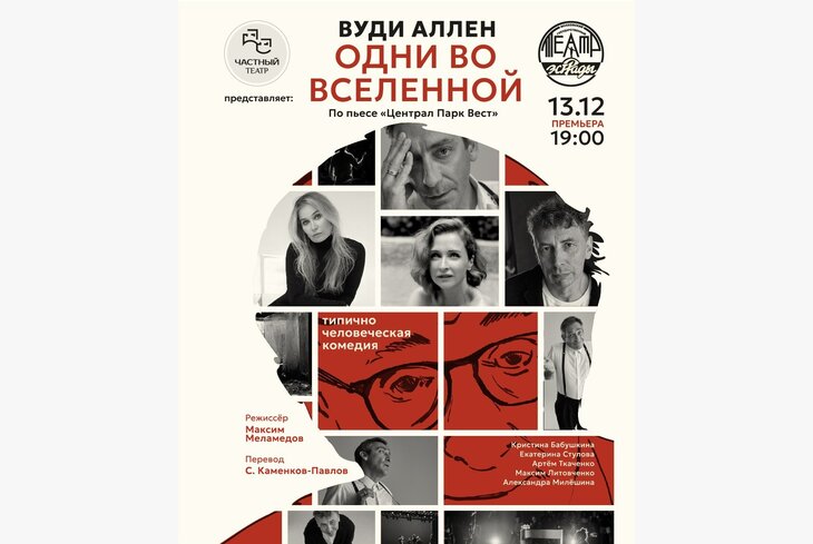 13 декабря в Театре эстрады независимый проект «Частный театр» представит новую интерпретацию пьесы Вуди Аллена «Централ-Парк Вест» — спектакль «Одни во вселенной». Об этом сообщает пресс-служба. 16+.