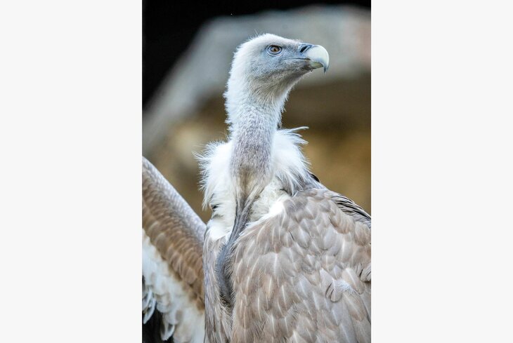 Молодой белоголовый сип уже прошел обязательный карантин и поселился в экспозиции «Скала хищных птиц» на старой территории, где живут его сородичи и черные грифы. Пол нового обитателя еще не определили.