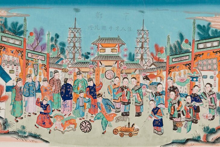 Раскрашенная новогодняя картина Янлюцина. «Талантливые юноши и красавицы на прогулке с фонарями». Эпоха Цин (1636/1644–1912)/ Предоставлено пресс-службой