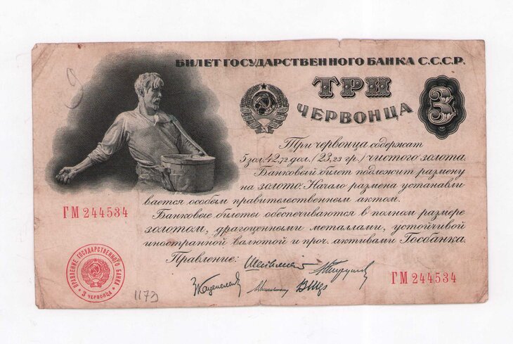 Билет Государственного банка СССР номиналом 3 червонца. 1924 г. СССР. Бумага, печать. Государственный исторический музей.