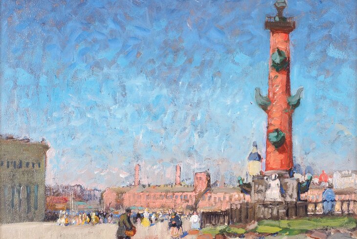 Константин Горбатов. «Пейзаж с Ростральной колонной на фоне домов». 1942 г.
