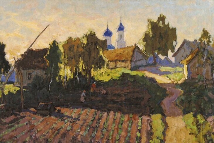 Константин Горбатов. «Деревенский пейзаж с полем и церковью». 1943 г.