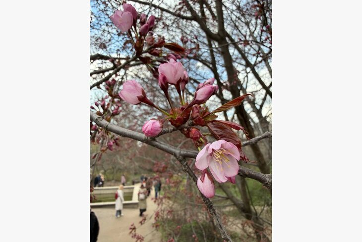 В Ботаническом саду МГУ «Аптекарский огород» распустилась первая сакура. Цветы появились у самого крупного вишневого дерева на территории. Об этом сообщается в социальных сетях ботсада.